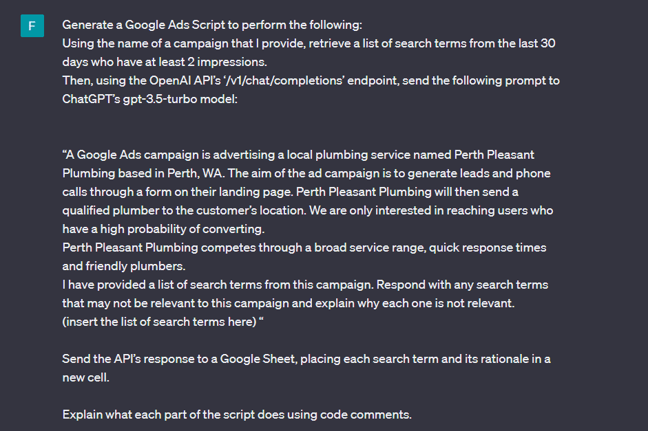 ChatGPT is an invaluable boon to the modern PPC toolkit. You can use it to identify negative keyword opportunities, create a script from scratch, communicate with itself and give you a shortlist of irrelevant search terms. You’re also ready to get started with modifying it further and making it your own.